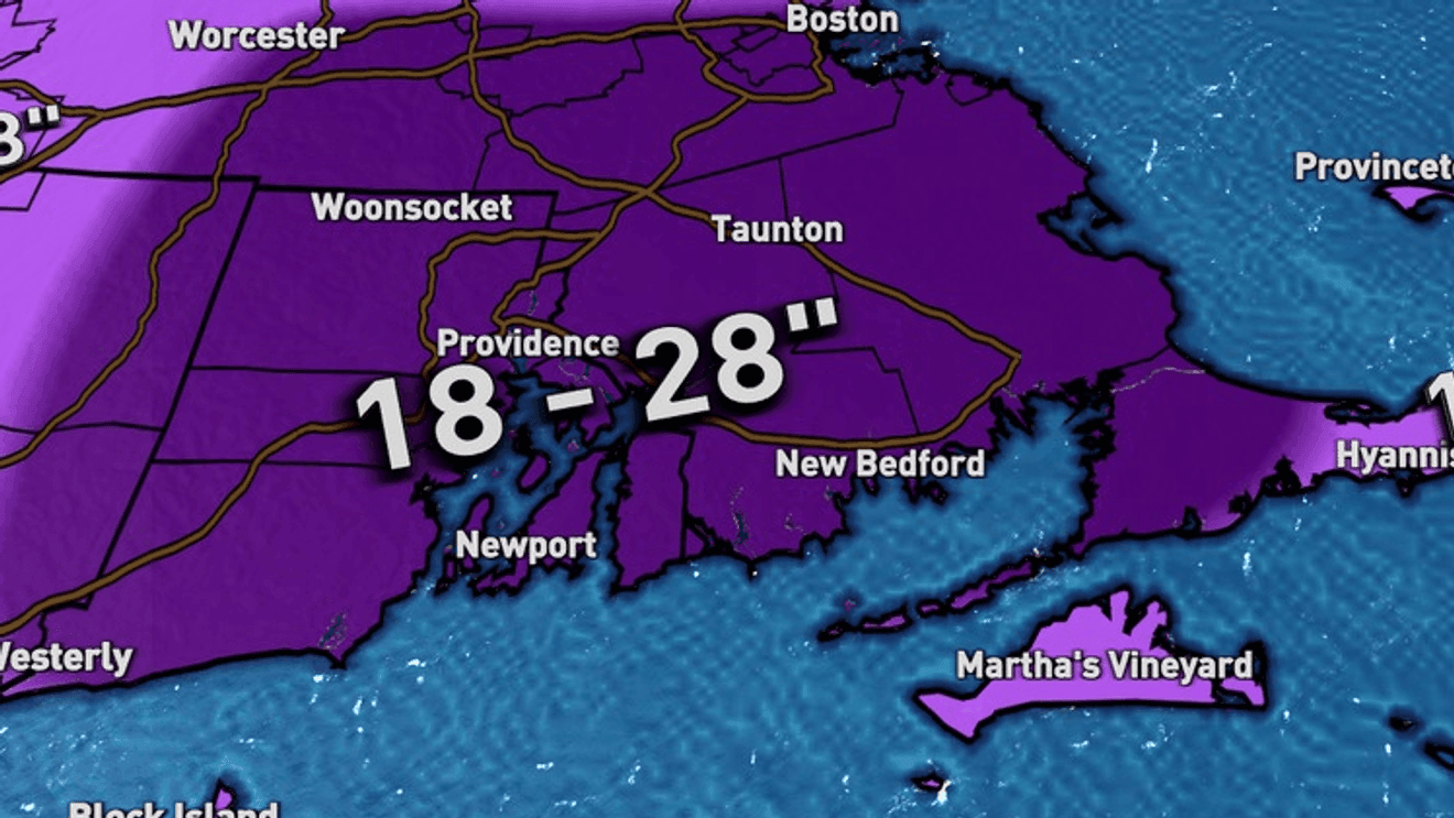 The snowfall forecast indicates a significant accumulation for Rhode Island and eastern Massachusetts, with widespread totals of 18 to 24 inches across most areas and 12 to 18 inches along the immediate south coast and toward the Cape Cod canal. Travel disruptions are expected as road conditions rapidly deteriorate, becoming impassable under the blizzard conditions of heavy snow and strong winds.